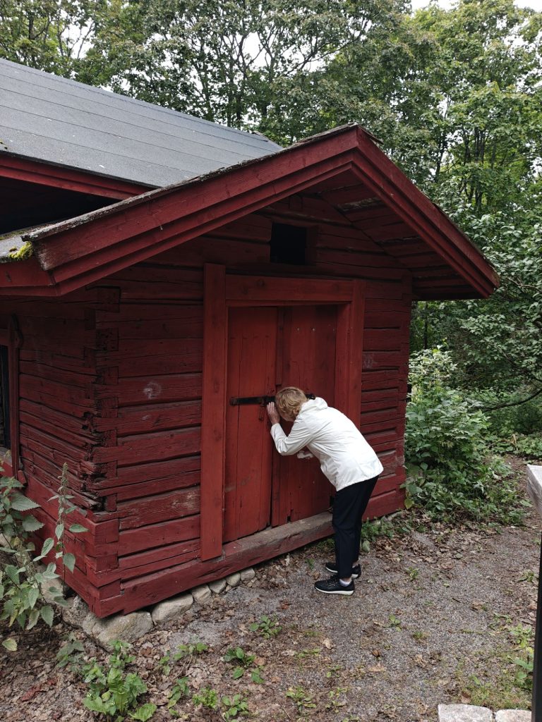 Nykyään punainen hirsitalo kartanon vieressä oli tuolloin harmaa. Siinä asuimme ensimmäisenä kartanolle tullessani. Muistelen sisällä olleen paljon tavaraa. Talossa oli kaksi lämmintä huonetta: keittiö ja makuuhuone, jonne levitettiin yöksi siskonpeti. Makuuhuoneessa oli takka ja keittiössä vanha hella.