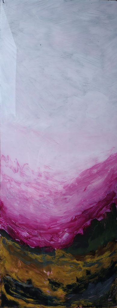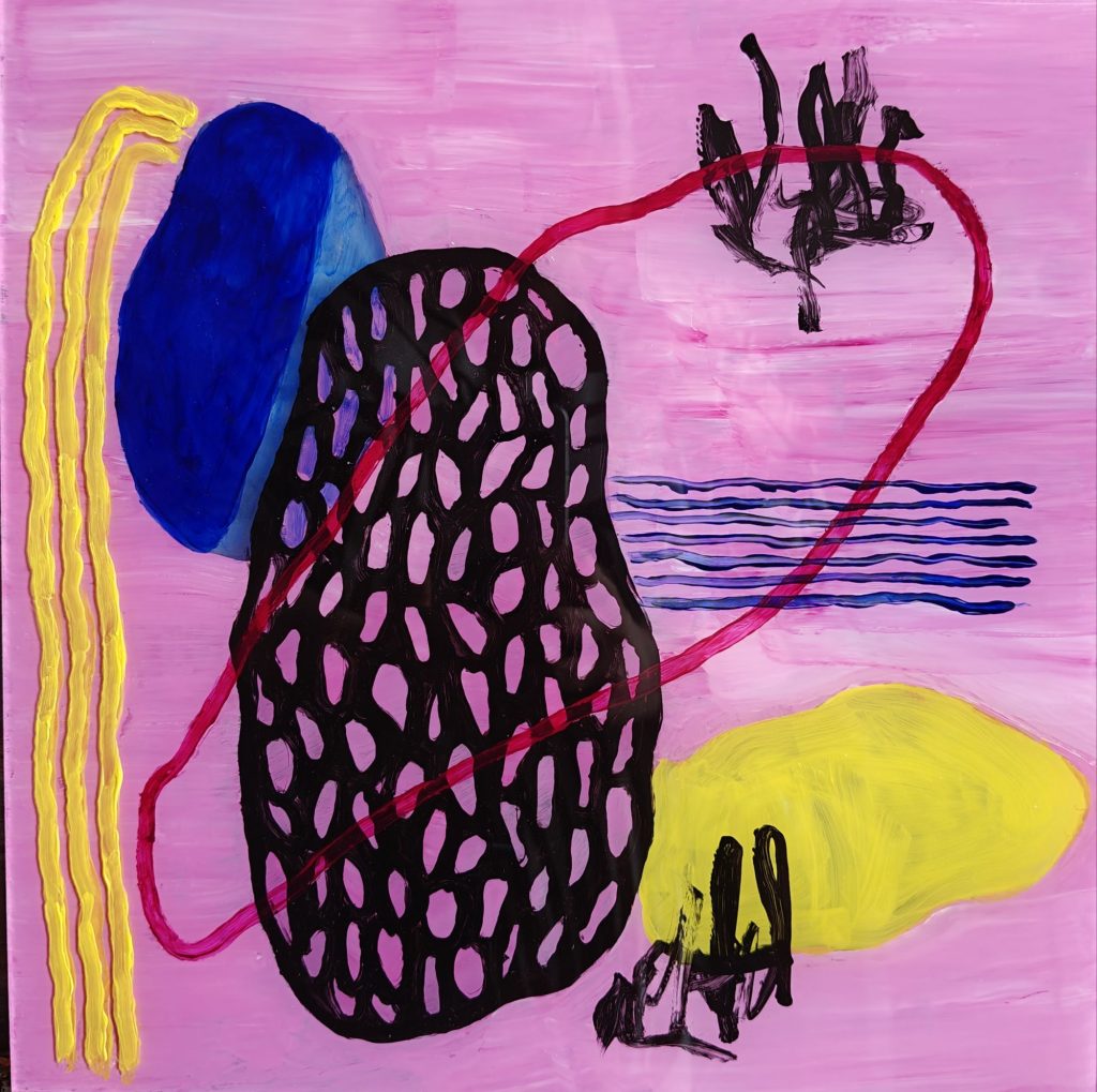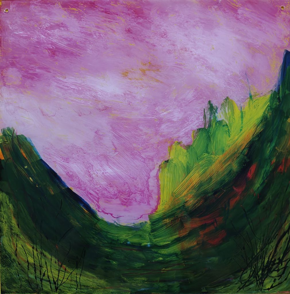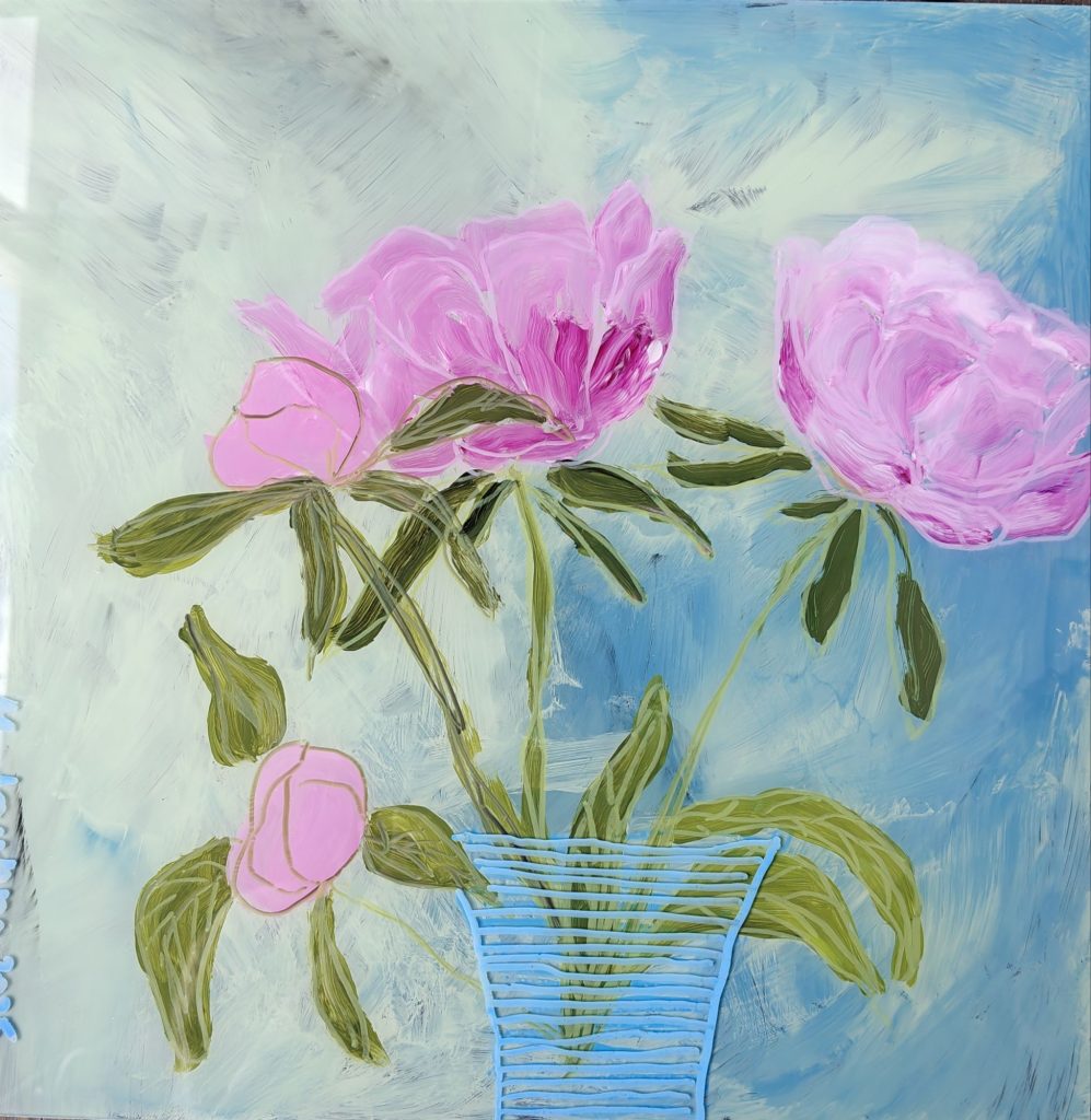 Tänä keväänä olen tutustunut uuteen materiaaliin, pleksiin ja akryyleillä sille maalaamiseen. Tämä uusi materiaali on tuonut työskentelyyn aivan omanlaistaan innostusta ja yllätyksellisyyttä. Nautin suunnattomasti sen tarjoamasta uudenlaisesta maalauskokemuksesta – erityisesti siitä, että lopputulos paljastuu vasta, kun työn kääntää. Tämä piilotettu puoli työskentelyssä tuntuu kiehtovalta: maalatessa ei täysin tiedä, miltä teos näyttää valmiina, mikä tuo työskentelyyn sekä leikkisyyttä että jännitystä. Pleksille akryyleillä maalatun teoksen monikäyttöisyys viehättää minua suuresti: pleksiteoksella saa taidetta esimerkiksi kosteisiin tiloihin sekä puutarhoihin!