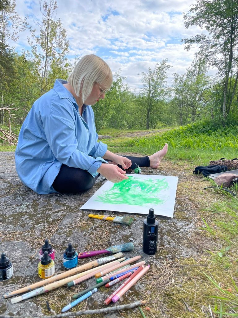 Tästä lähin aloitan aina maalaamisen näillä Annin opeilla aisteja availlen. Pyrin kiipeämään (aina kun mahdollista) kalliolle, hakeudun luontoon, riisun sukat ja annan aistien viedä minua ja tekemistäni oikeaan suuntaan. Annan kehon kuulla, kuunnella, tuntea, liikkua – ja siirtää tuntemukset kankaalle, paperille, pleksille.