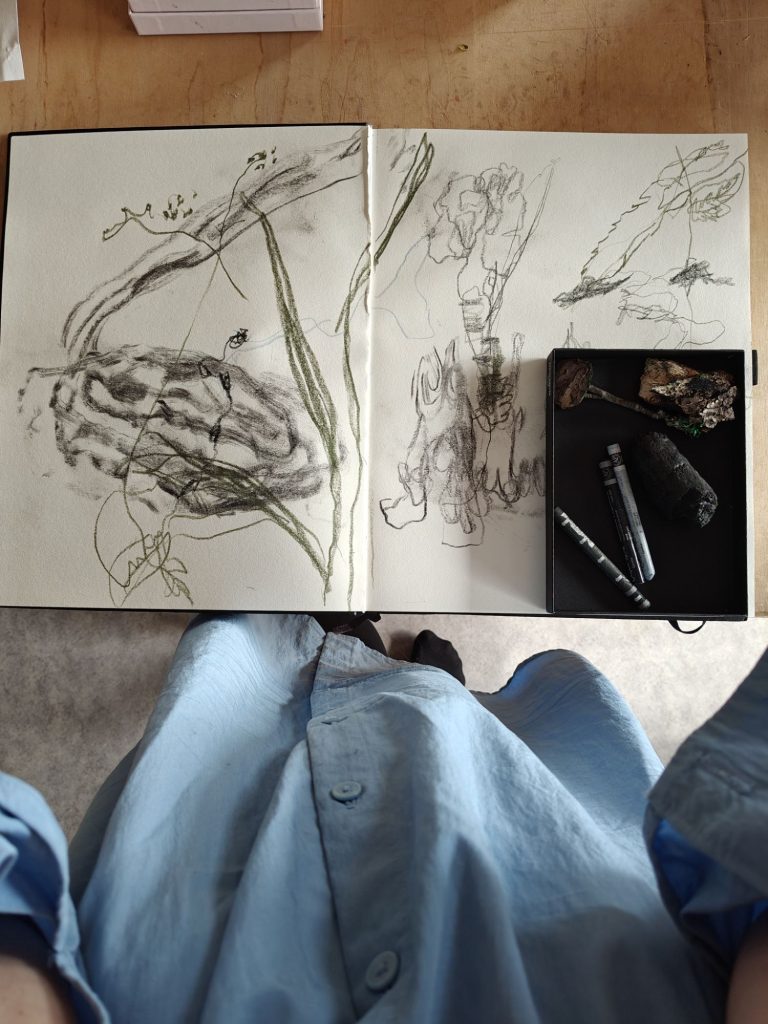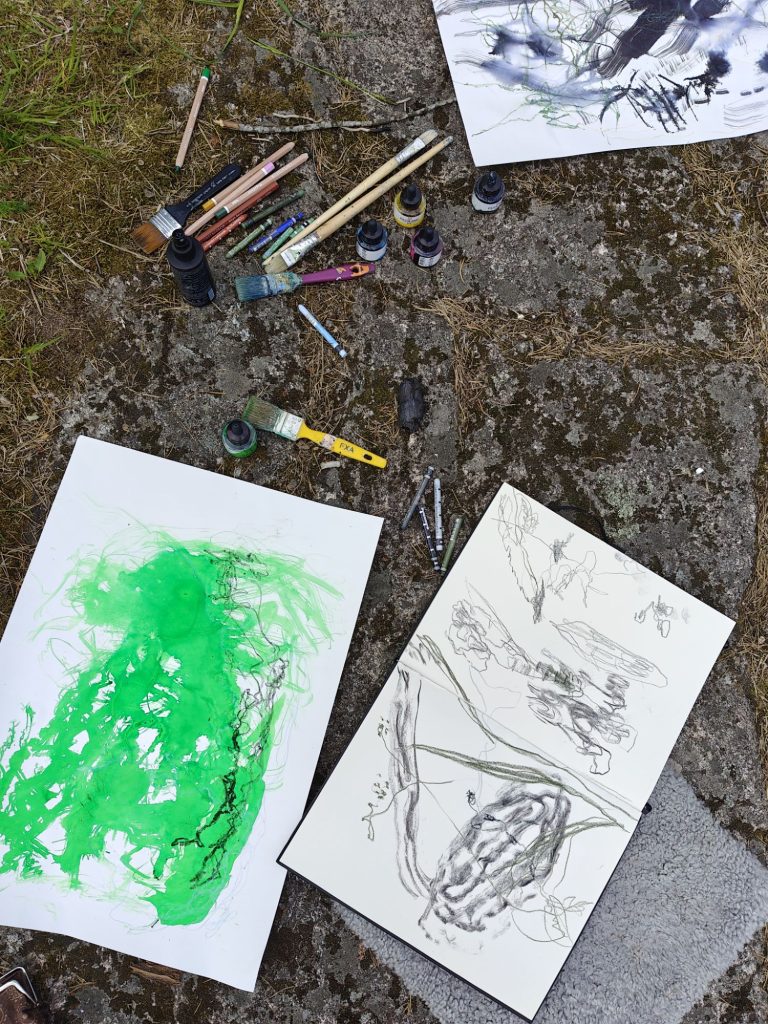 Paljaat varpaat kalliolla. Tunnen kallion kovuuden ja muodot jalkojeni alla. Tuulee. Ohi ajavien autojen äänet hälvenevät, kun keskityn lintujen lauluun. Suljen silmäni ja tunnustelen kädellä paperin alla juoksevia kallion muotoja, piirtäen niitä samalla liidulla. Tätä voisi tehdä tunteja. Kerään kalliolta kaarnanpaloja, oksia, retkeilijältä jääneestä nuotiosta hiiltä. Niillä piirtäminen tuntuu vapauttavalta. Viiva on kaunis, ei ollenkaan väkinäinen tai liiaksi harkittu.