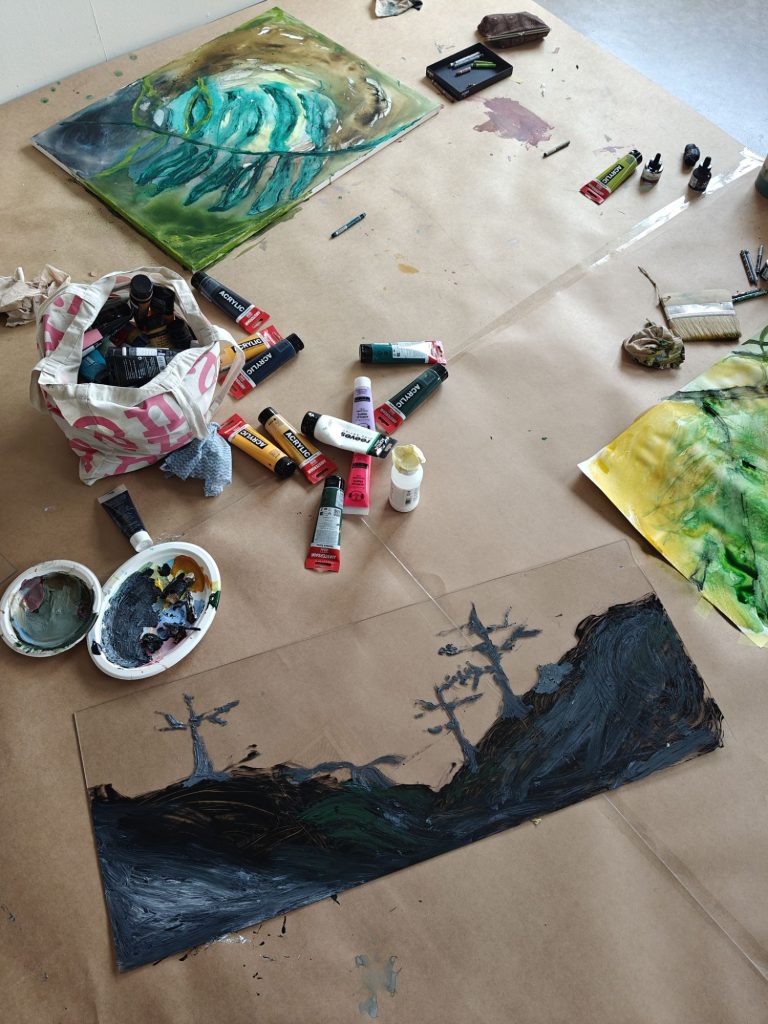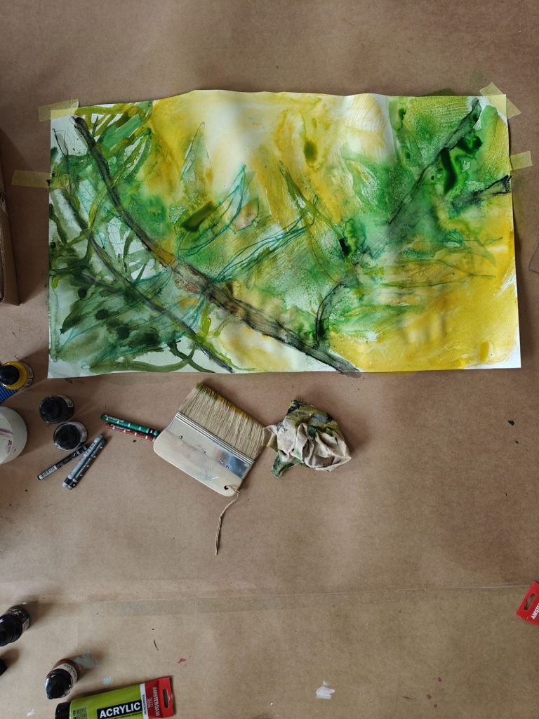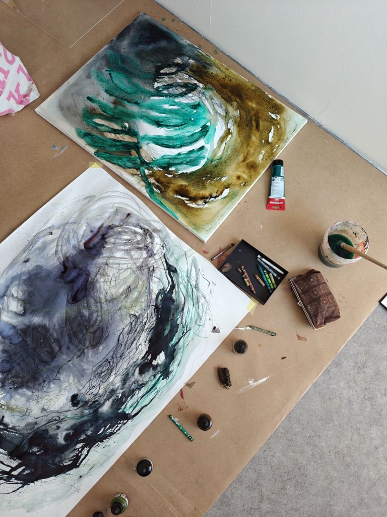 Tämä kehollinen lähestyminen on tullut yhä tärkeämmäksi osaksi mun päättötyöprosessia. Siinä missä ennen olin taipuvainen kontrolliin ja suorittamiseen, nyt annan kuplinnan viedä. En pakota, en suorita, en kontrolloi. Vaan kuuntelen. Annan itselleni luvan liikkua – kehon kautta, käden kautta, värin ja rytmin kautta. Uppoudun siihen tilaan, missä ajattelu hiljenee ja jälki syntyy itsestään.