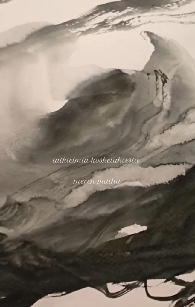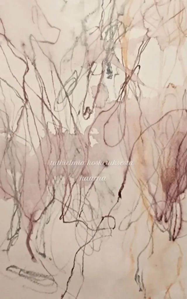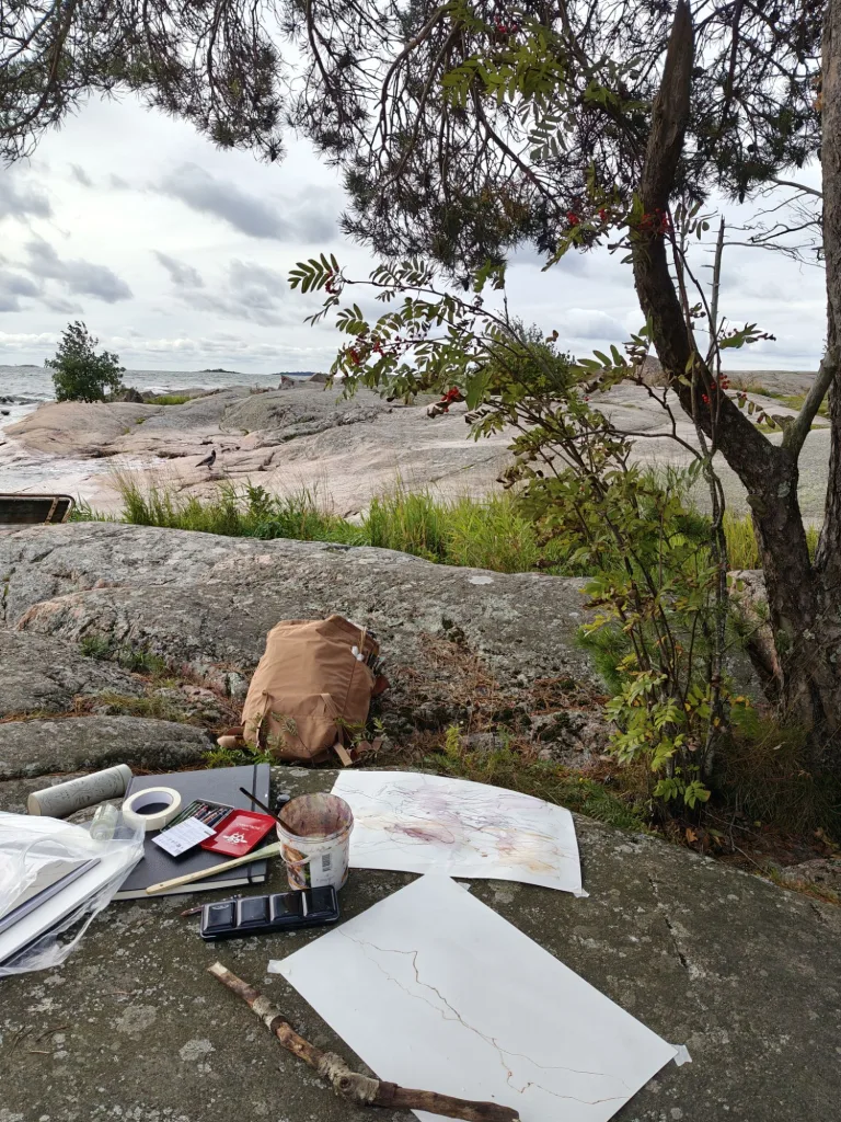 Ensimmäisellä kerralla tein akryylimusteilla sarjan teoksia, joiden lähtökohtana oli kysymys: miltä kosketus näyttää? Annoin tuulen, meren pauhun, puun oksan ja kallion sekä kaarnan puhua minulle tunto- ja kuuloaistin kautta. Syntyi pieniä tutkielmia, jotka tallensivat hetkellisiä kokemuksia, rytmiä, tekstuuria ja kehollisia tuntemuksia.