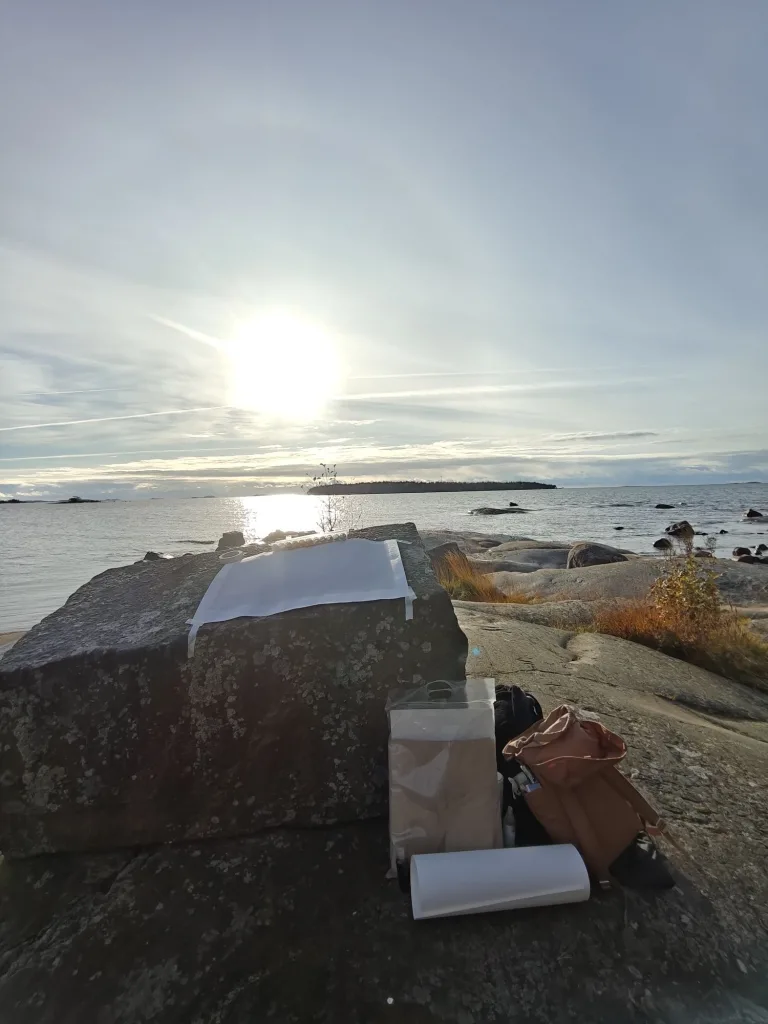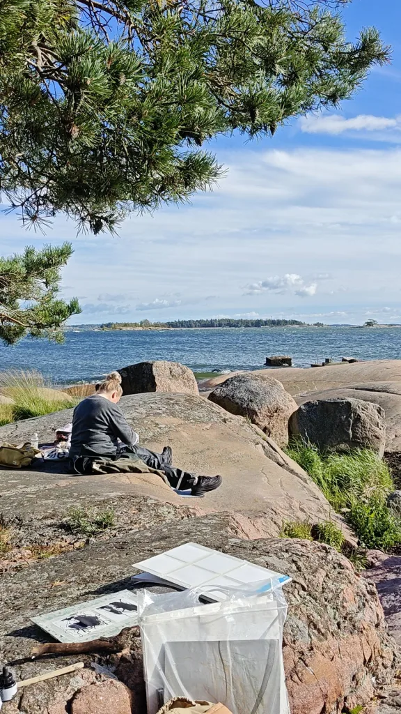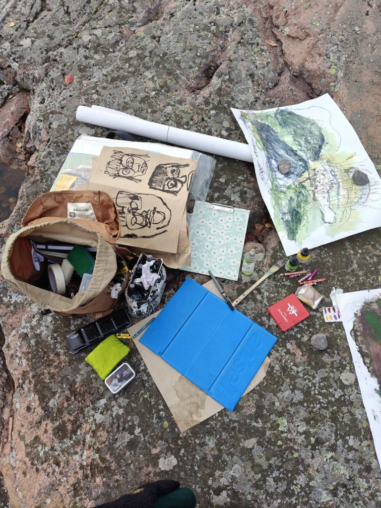 Toisella kerralla olimme jälleen Lauttasaaren kallioilla. Teimme luonto-croquis -lämmittelyjä ja havainnoimme ympäristöä kosketuksen kautta. Kallion muodot, maiseman yksityiskohdat ohjasivat liikettäni. Harjoitteet tuntuivat siltä kuin olisin keskustellut maiseman kanssa: jokainen viiva oli hetken vastaus siihen, missä olin ja miltä maa jalkojen alla tuntui.