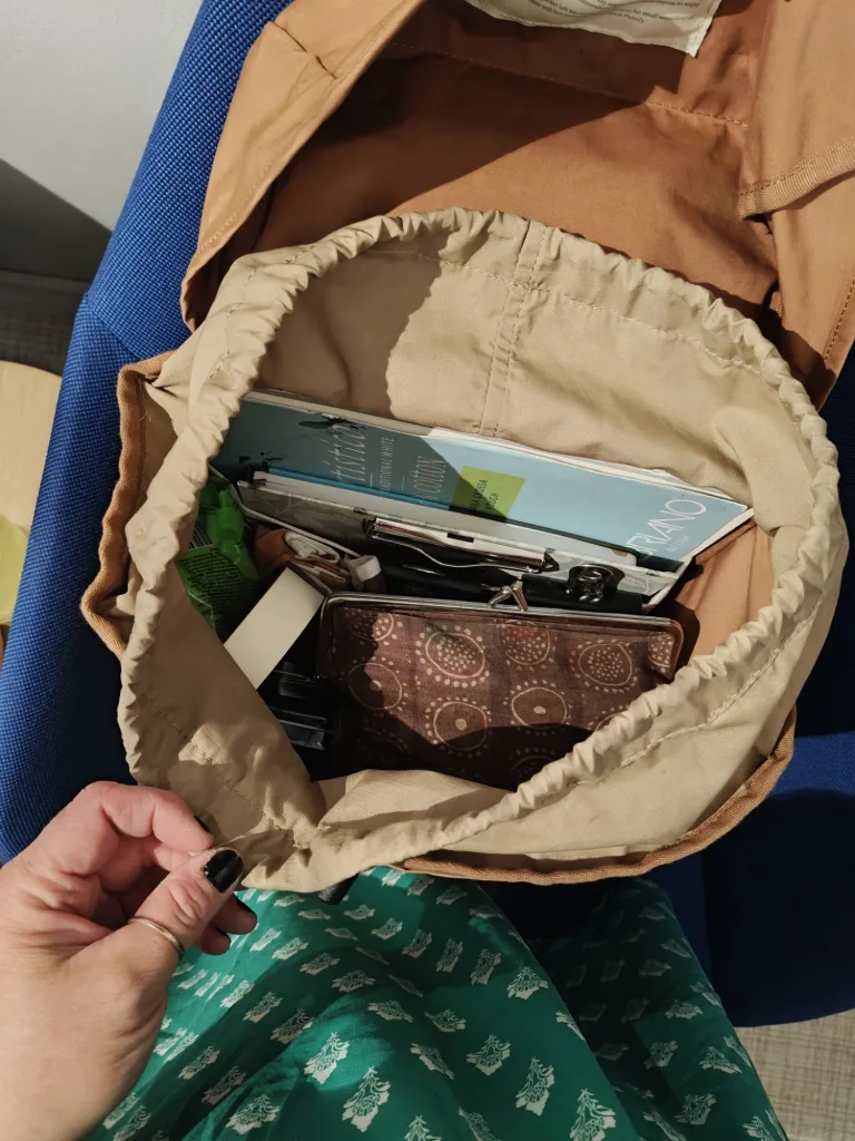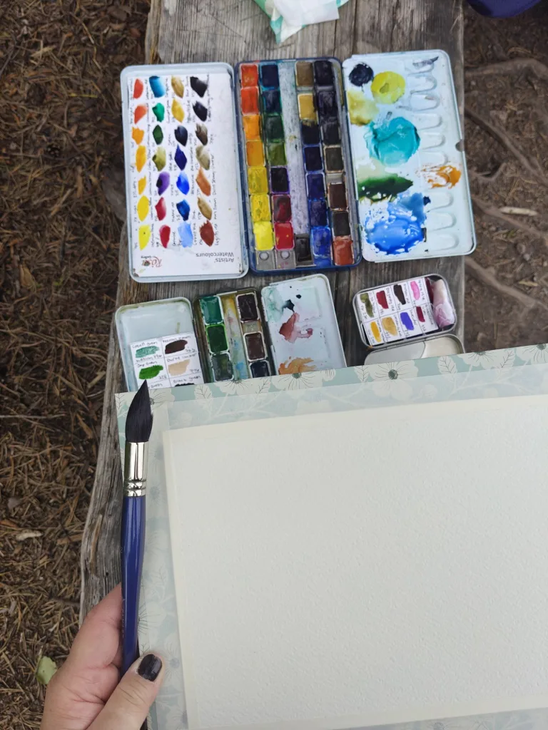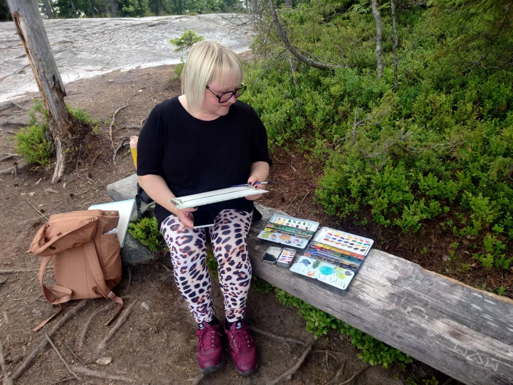 Ostin Partioaitan alesta ennen reissua kunnon Fjällrävenin retkirepun, jossa on paljon tilaa, taskuja ja kunnon leveät olkanauhat. Tästä repusta tuli mun THE ulkomaalausreppu, joka on aina valmiina lähtöön! Reppuun olen pakannut muutamia luonnoskirjoja, irtopaperia, alustan, maalarinteippiä, suihkepullon, kannellisen vesikupin (vanha lääkekippo), siveltimiä ja muita maalausvälineitä (suti, vanha pankkikortti..), akvarellivärit (myöhemmin myös guassit), rättejä, talouspaperia, klipsejä, istuintyyny… Myöhemmin kesällä repun lisäksi kannettavaksi hankin pienen kevyen ulkomaalaustelineen Kärkkäiseltä, n 14€ ja tämä ajaa asiansa todella hyvin!