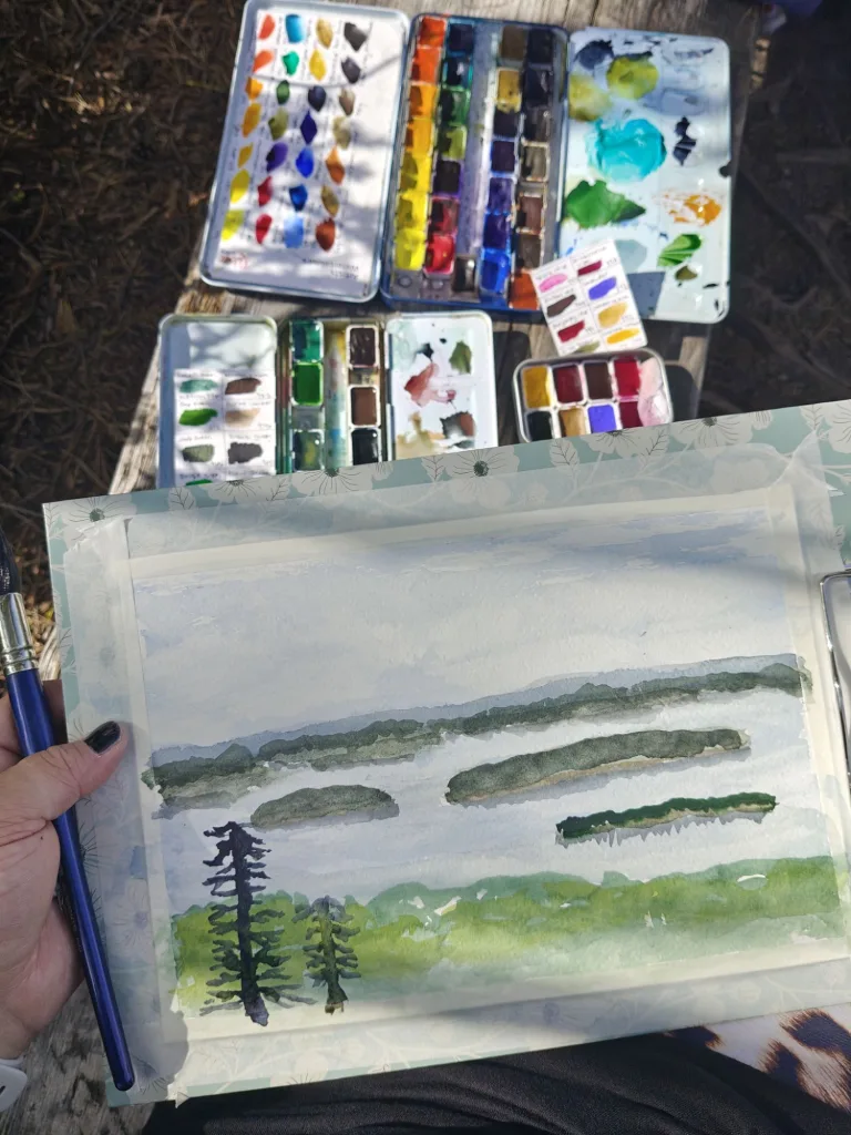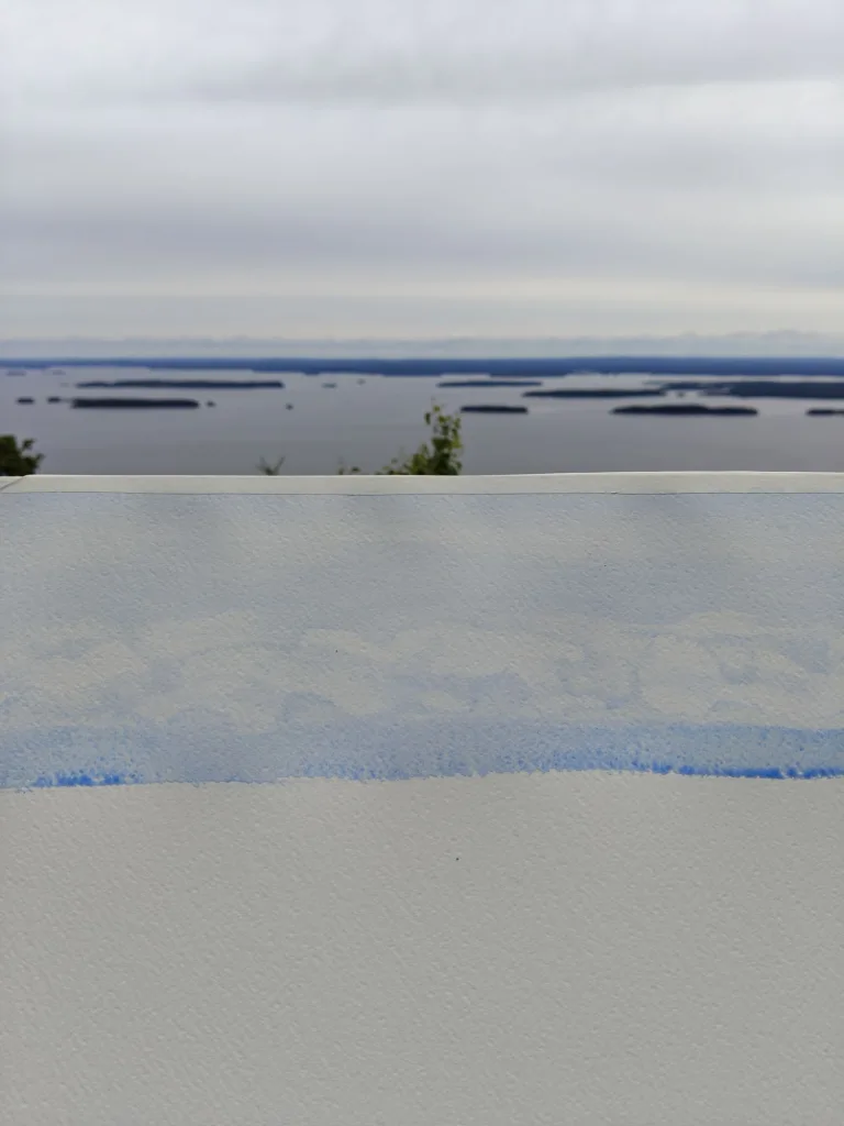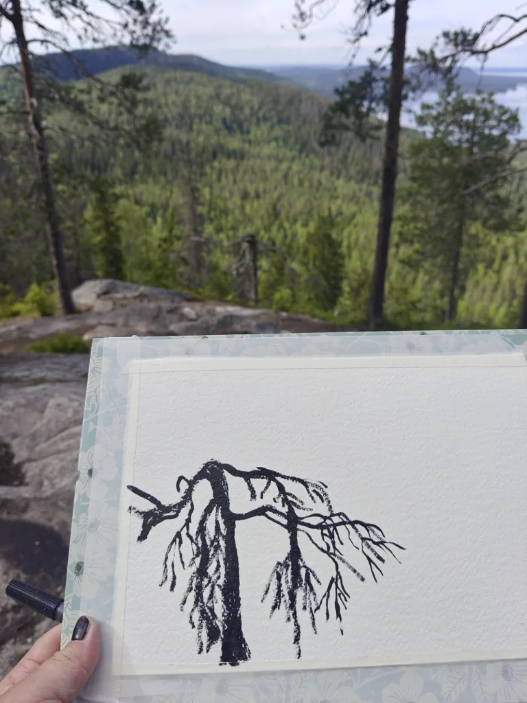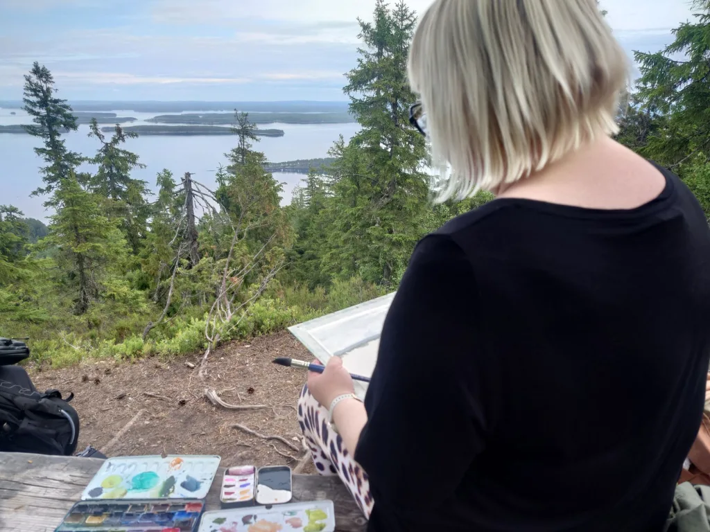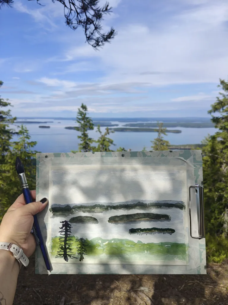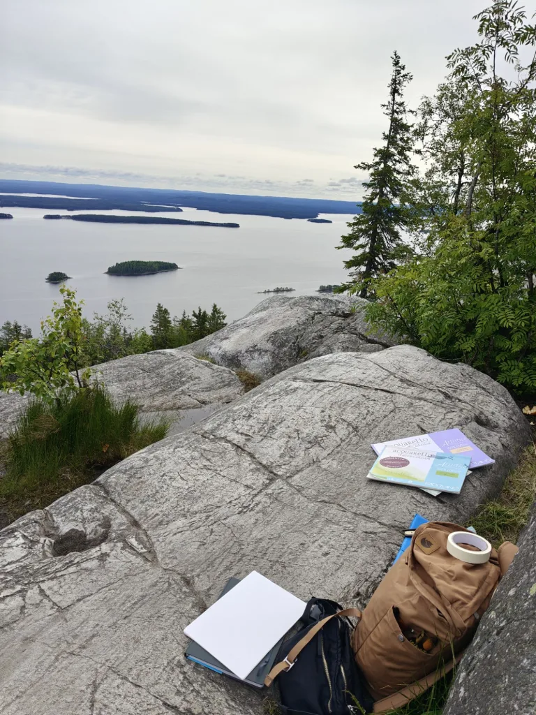 Maalausvälineet kulkivat mukana repussani, aivan kuten Eero Järnefeltillä aikanaan. Oli erityinen tunne astua hänen jalanjälkiinsä, kulkea niitä samoja polkuja, joissa suomalainen maisemamaalaus sai aikoinaan sielunsa. Nousut vaarojen huipuille olivat jyrkkiä ja ajoittain todella haastavia ainakin mun kunnolla, mutta jokaisen askeleen arvoisia. Kun saavuin huipulle, kipu jaloista ja paino selästä unohtuivat upean maiseman edessä seisoessa välittömästi.